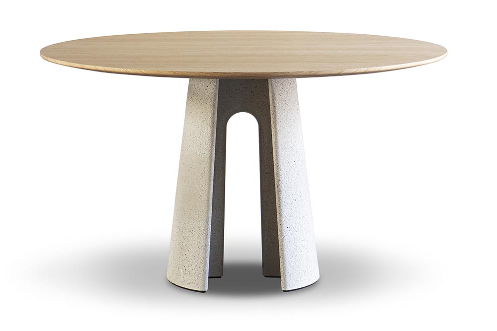 Magis komt met deze tafel Ancora van Ronan Bouroullec. Het houten tafelblad wordt ondersteund door een betonnen voet. Naast deze ronde tafel met een diameter van 130 cm, is er ook een rechthoekig model van 220 x 90 cm. De geheel betonnen versies zijn ook geschikt voor buiten. www.magisdesign.com