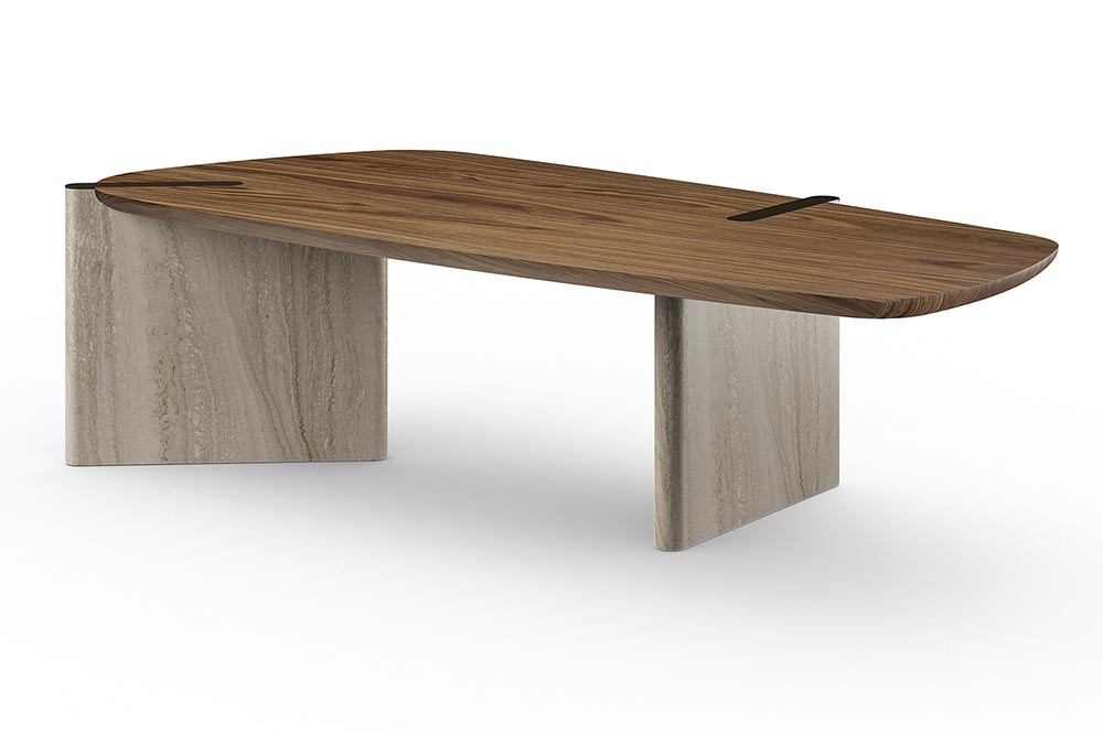 Een even simpel als sterk tafelontwerp van Bonaldo. Flatiron is een strakke tafel opgebouwd uit elementaire vormen en volumes. De metalen inserts in het trapeziumvormige houten tafelblad zijn niet alleen een verlengstuk van de natuurstenen poten, maar hebben ook een praktische functie als kabelgoot. De poten kunnen ook in hout of lak (lood- of bronstinten). In twee maten: 180 x 85 cm, 245 x 110 cm. www.bonaldo.com