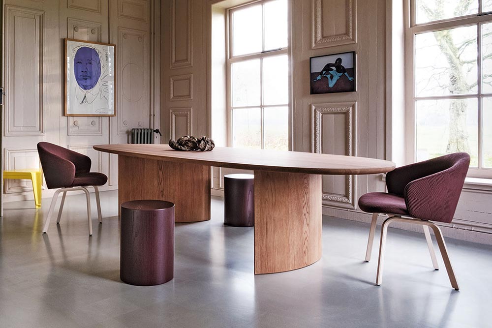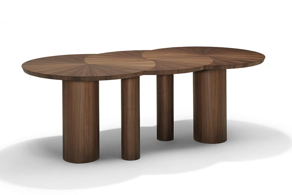 De tafel Bisou van Linteloo, Frans voor kus, heeft een bijzonder decoratief blad. Afhankelijk van de lengte grijpen twee of drie cirkels in en om elkaar. Het walnootfineer waaiert uit als de stralen van de zon. Een indrukwekkend staaltje ambachtelijk vakmanschap. In 165 x 110 cm (met twee rondingen) en 220 x 110 cm (met drie rondingen). www.linteloo.com