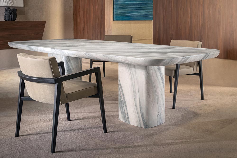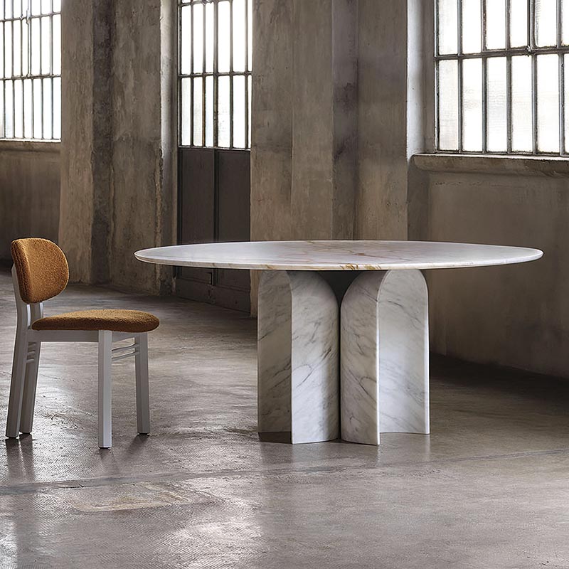 Le Cupole is een tafel met een sterke visuele impact. Het onderstel bestaat uit drie marmeren gebeeldhouwde koepels (cupole in het Italiaans). Ze geven een gevoel van symmetrie en dynamiek. Mooi detail: de messing inzetstukken in de bogen. Verkrijgbaar in Calacatta Oro marmer (foto) en Nero Marquinia marmer.