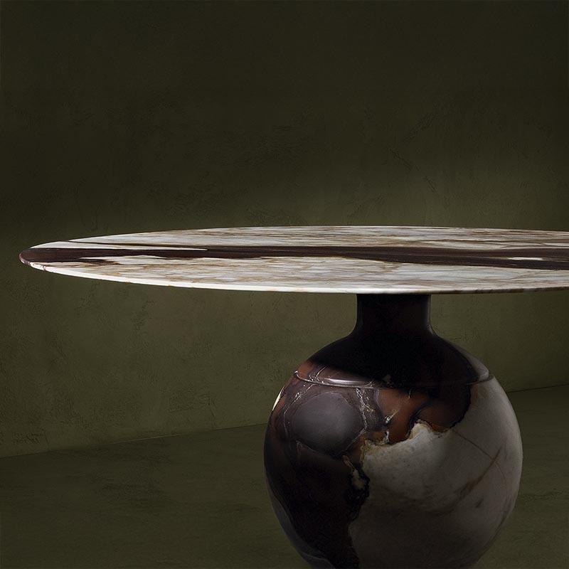 Marmeren tafels zijn een absolute trend. Elke marmersoort heeft zijn eigen adering en kleuren. Derhalve is elke marmeren tafel anders; uniek én duurzaam, want marmer gaat meer dan levenslang mee. Karakteristiek voor deze monolitische tafel King van het Italiaanse merk Kreoo is de grote, bolvormige poot. In een veelheid aan verschillende maten en marmersoorten.