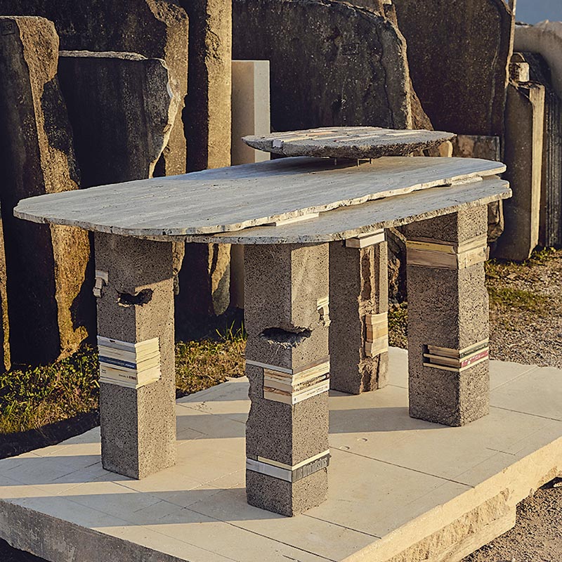 Literair Beton, zo zou je de meubelcollectie van de Libanese/Franse Aline Asmar d‘Amman kunnen vertalen. Haar tafels, boekenkasten en -steunen zijn allemaal unieke, handgemaakte stukken van gegoten beton met ingebedde boeken. Het tafelblad is van grijs travertijn. Een tafel met een even ruwe als poëtische uitstraling (Foto: Giulio Ghirardi).