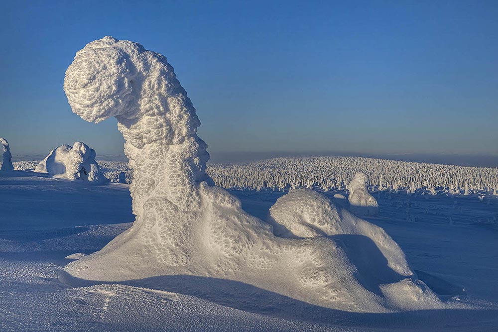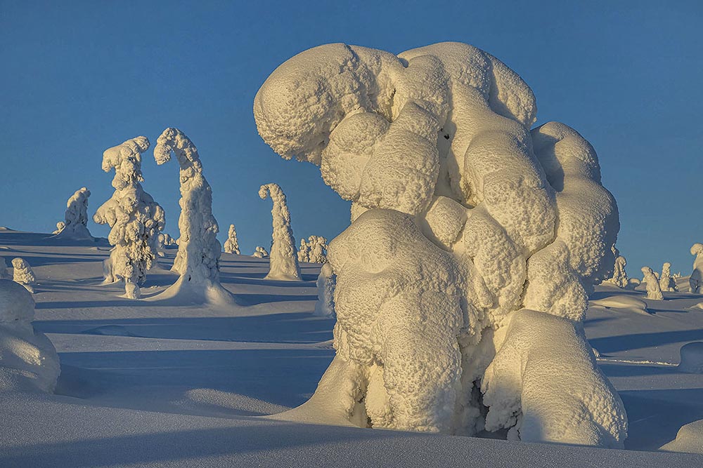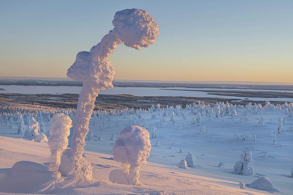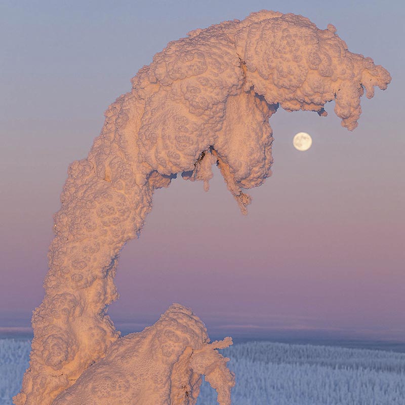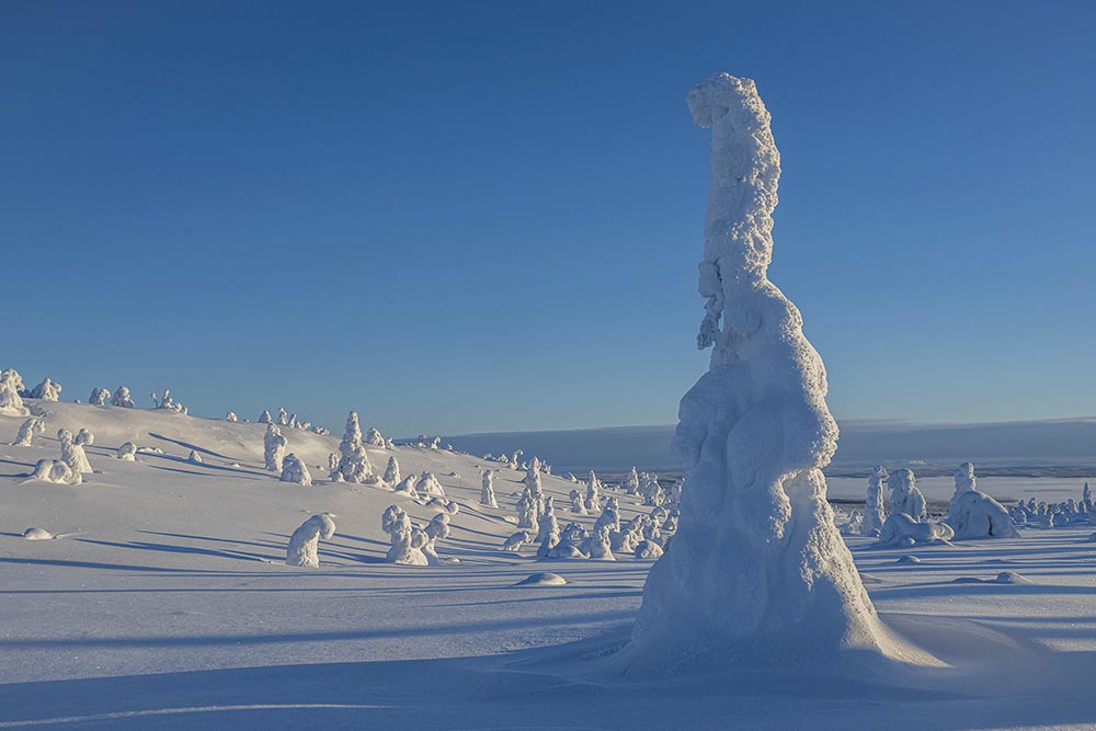 In januari is de winter in Lapland op zijn hoogtepunt, en tuimelen temperaturen gemakkelijk meer dan dertig graden onder het vriespunt. De groene bossen van de zomer hebben plaatsgemaakt voor een in sneeuw gehulde sprookjeswereld, waar de tijd lijkt stil te staan. Een totale transformatie naar een magische, witte wereld, waar de stilte slechts af en toe wordt onderbroken door het zachte geruis van sneeuw die van de takken valt. Elke stap voelt als een inbreuk op de serene sfeer. Een magisch land dat meer weg heeft van een droomwereld dan van een winters bos. Op de meer open vlakten zijn bomen ingepakt in een dikke laag sneeuw en zien eruit als bizarre sneeuwsculpturen: trolachtige wezens die moedig de kou trotseren. Een land van legendes, die hier bijna vanzelf ontstaan.