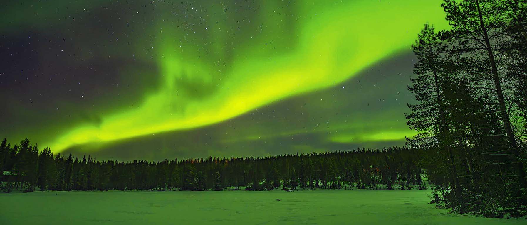 Aurora Borealis, het noorderlicht. Uit het niets verschijnen plotseling groene en rode golvende lichtgordijnen in de lucht, die als lichtgevende mistflarden de magie van het landschap perfectioneren. Traag meanderende rivieren van groen en roze licht boven de bevroren bossen, die de atmosfeer tot leven wekken.