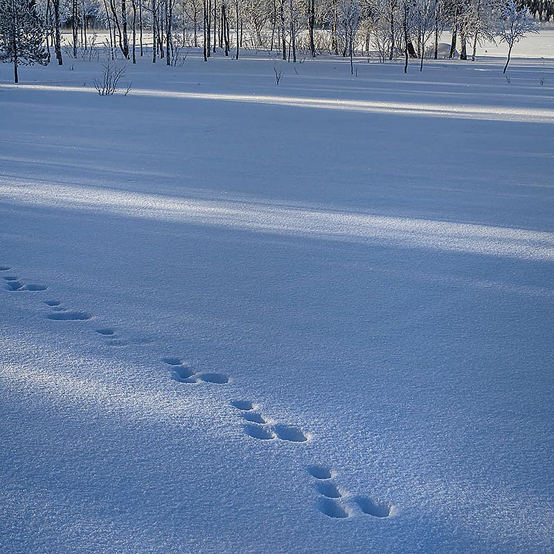 Ook dicht bij de grond kan winters Lapland meer dan interessant zijn. Sporen in de maagdelijk witte sneeuw zijn stille getuigen van de weinige dieren die de kou weten te trotseren. Een kenmerkend spoor met vier pootafdrukken bij elkaar is onmiskenbaar: hier heeft een sneeuwhaas gelopen. Tijdens het springen zet het dier de grote achtervoeten voorbij de veel kleinere voorvoeten neer, waardoor het spoor niet te verwarren is met dat van andere dieren.