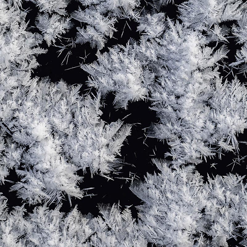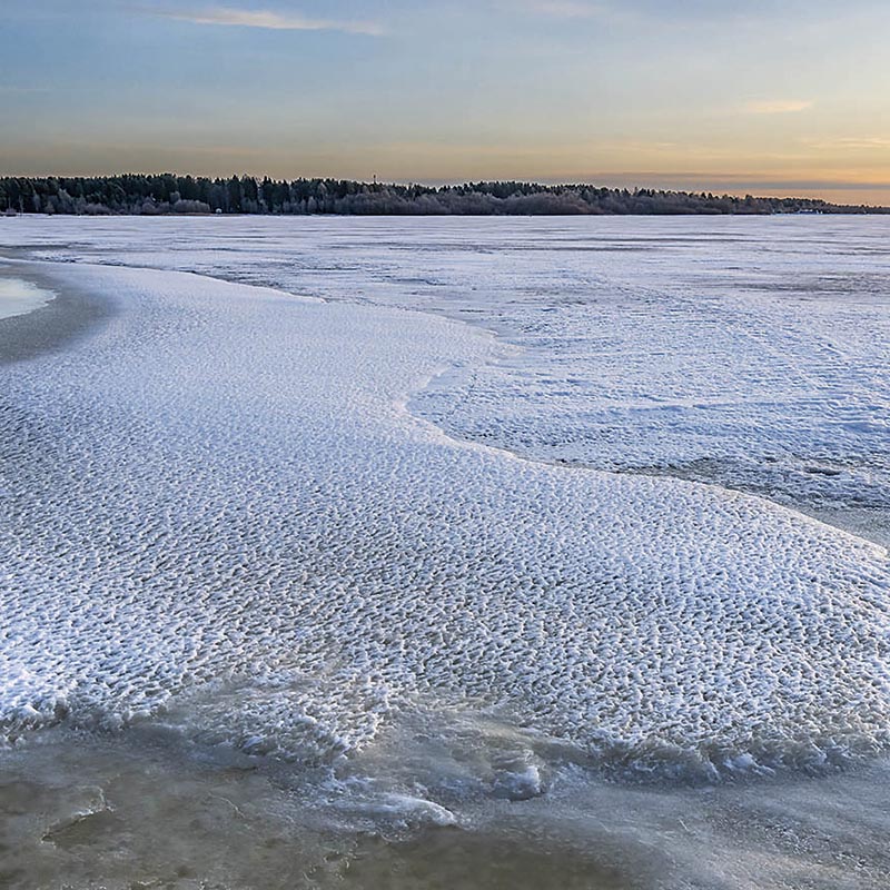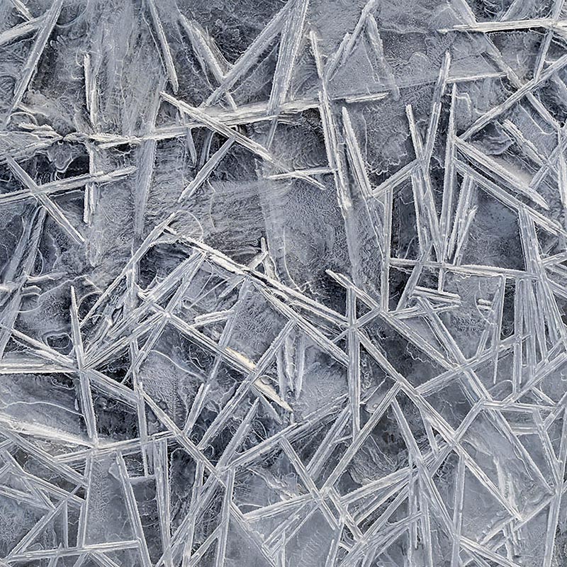 De vorst creëert ook fraaie pareltjes, zoals ijspatronen van door de wind opgestuwd water, en ijskristallen in talloze vormen: van puntige naalden tot veerachtige structuren. Even verderop zijn berkentakken gehuld in een fragiel laagje ijskristallen, alsof een meesterbakker ze met een fijn suikerglazuur heeft bestrooid. Met een lage zon transformeert zo’n beijsd berkenbos in een woud van zilver, waar subtiel tinkelende geluiden van de bevroren takken het enige geluid zijn. Een feest voor de zintuigen.