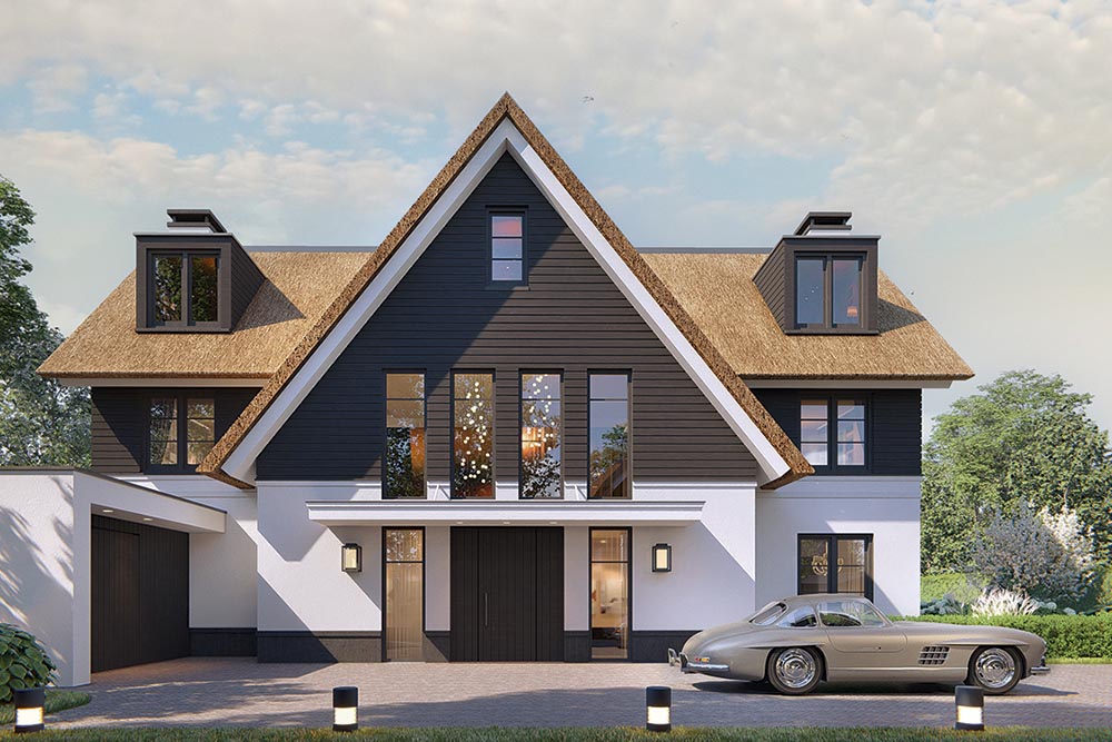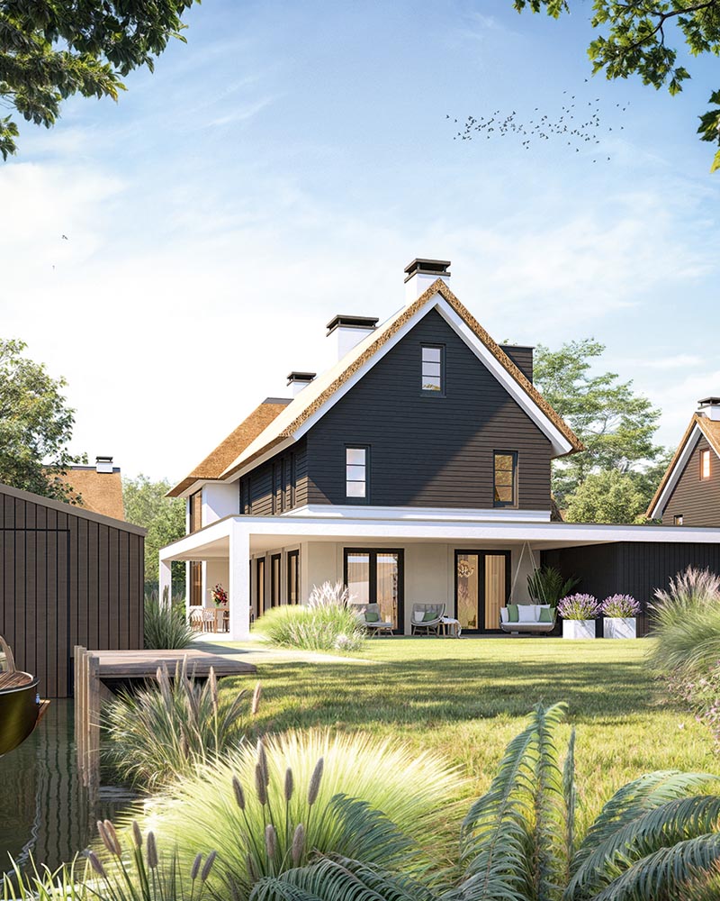 Architect Britta van Egmond ontwierp samen met haar broer Diederik deze exclusieve villa’s. “Voor ons stond voorop dat we een thuis wilden creëren waar mens en natuur samenkomen. Een plek waar je tot rust komt en het leven viert.” Op Ganzeneiland krijgt die visie vorm: zes luxe villa’s aan het water, ontworpen als één samenhangende architectuurfamilie. Door variatie in plaatsing op de kavels – breed of juist diep – ontstaat een verrassend straat- en waterbeeld, binnen een stijl die rust en harmonie ademt. De uitstraling is klassiek en eigentijds tegelijk: wit gestucte gevels, donkere kozijnen, houten accenten en een rieten kap als warme deken. Grote raampartijen en openslaande deuren zorgen voor licht, uitzicht en verbinding met buiten, terwijl zelfs het boothuis in stijl wordt mee ontworpen.