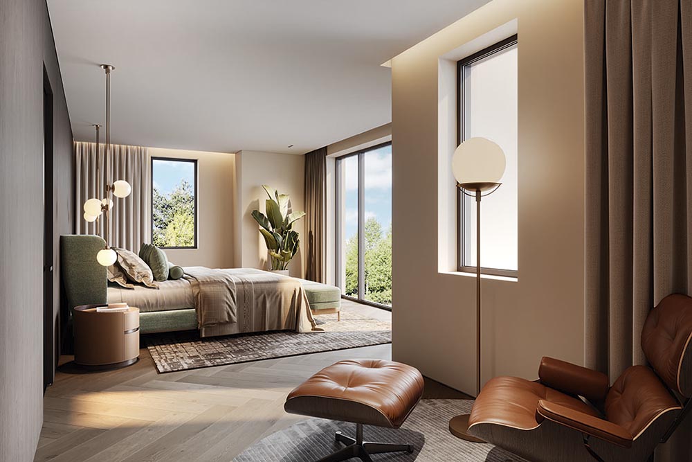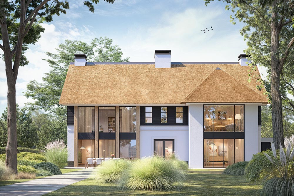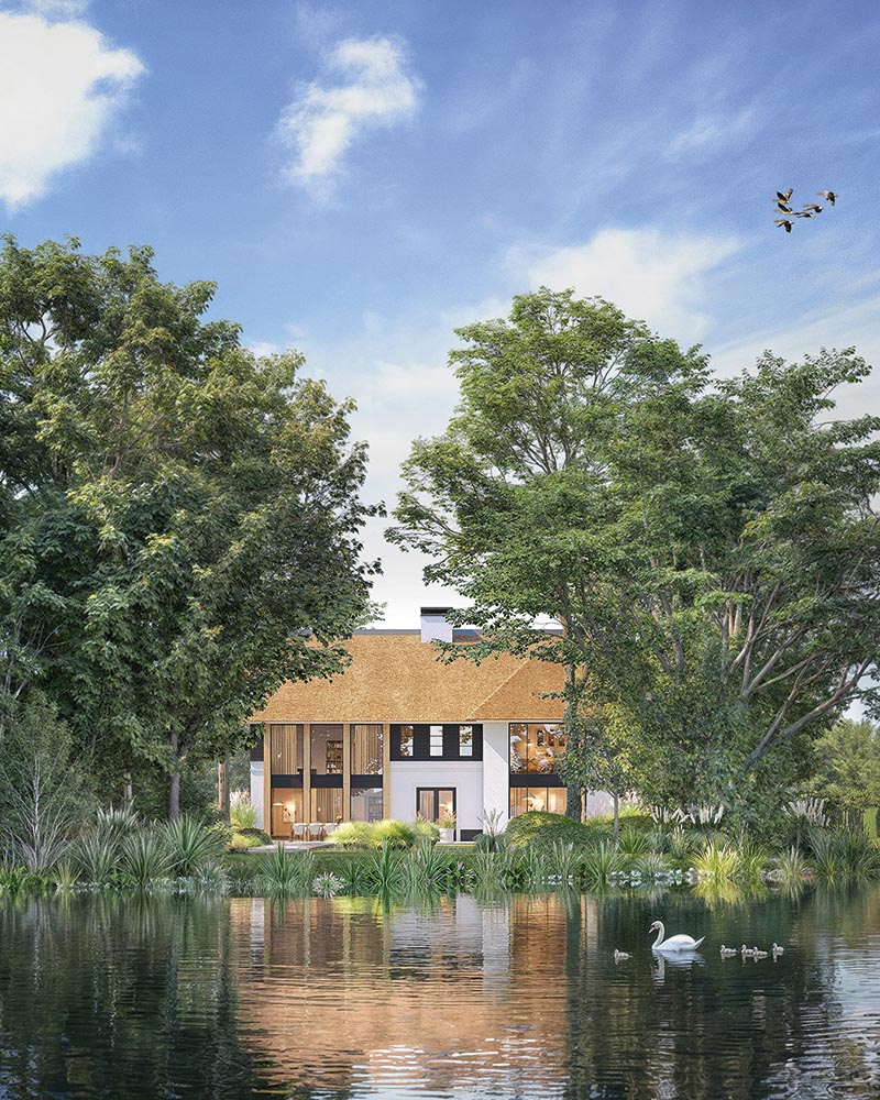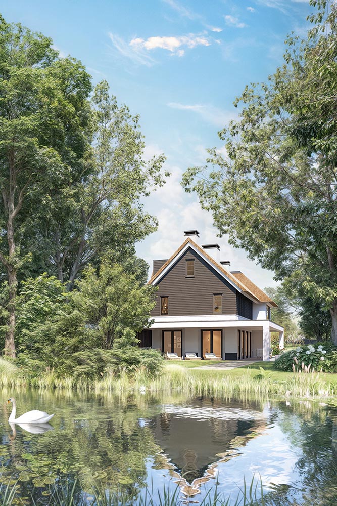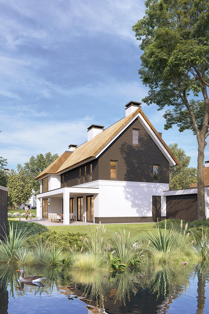 Voor ontwikkelaar Guido Schmitt van Fresch Real Estate begint elk plan met de vraag: wat verdient deze plek? Bij Ganzeneiland in Oegstgeest was dat meteen duidelijk: rust, ruimte en groen zijn hier de kern. Zijn ambitie was villa’s te realiseren die niet alleen passen in het landschap, maar dit ook versterken. Dat betekent royale kavels, ruime afstanden tussen de woningen en maximale privacy zonder uitzicht te verliezen. De inspiratie kwam van de Leede, waar landhuizen vanzelfsprekend opgaan in het groen. Deze sfeer is vertaald naar eigentijdse, landelijke architectuur met rieten kappen en veranda’s op het zuiden. Door zelf de participatiegesprekken met omwonenden te voeren, wist Schmitt vertrouwen te winnen en breed draagvlak te creëren voor het ontwerp.