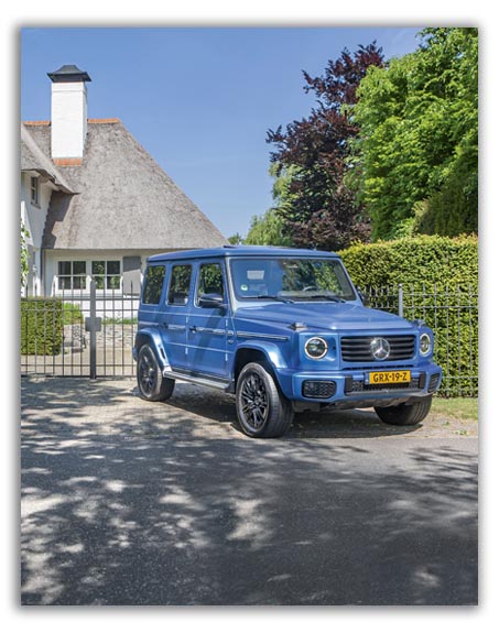 Filmregisseurs die de ideale ontsnappingsauto zoeken hoeven niet verder te kijken: dit is ‘m, de G 580! Het is ook dé auto om je King of the Road te voelen. Dankzij de vier motoren en 587 pk ben je bijna iedereen te snel af, is het terrein nooit te zwaar of onbegaanbaar en voel je je altijd boven vrijwel iedereen verheven. In een fullsize truck zit je weliswaar nog hoger, maar dan heb je nooit zoveel luxe en prachtafwerking om je heen, zoveel voorzieningen en zoveel directe power onder je rechtervoet. De volledig elektrische Mercedes-Benz G 580 is er vanaf goed anderhalve ton. Kies je een versie met brandstof-motor, dan lopen de prijzen uiteen van 2 tot ruim 3 ton. Het is dus nog een ‘koopje’ ook. Barstensvol historie en power. En… handgebouwd!