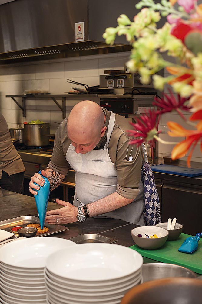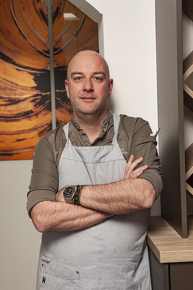 Hans Derks is een ander soort chef dan je vaak tegenkomt. Zeker, hij is kalend, getatoeëerd en heeft een tweedagenbaardje. Dat kom je vaker tegen. Maar zijn vrouw ontmoette hij niet in een ander restaurant en ze werkt ook niet mee in de zaak maar is HR-adviseur bij het Radboudumc in Nijmegen. Tijdens de gedwongen corona-sluiting stopte daardoor niet het hele inkomen en de HR-ervaring helpt ook bij het kiezen van goede mensen. “Zij is echt de stille kracht op de achtergrond”, zegt Derks. Kapsones zijn er evenmin; hij loopt ook gewoon in de bediening mee. Derks zoekt versterking van zijn team, maar veel jongeren van nu willen niet meer in de horeca werken: dat is ze te druk en stressvol…. “Wij zijn hier nu tien jaar actief en sinds 2020 hebben we een Michelinster. Die is ons echt overkomen. Maar sinds we ‘m hebben wil ik die ster wel behouden. En ik wil leuke gasten van alle leeftijden ontvangen, die enthousiast terugkeren. Dat zorgt voor continuïteit en daar gaan we hier voor!”