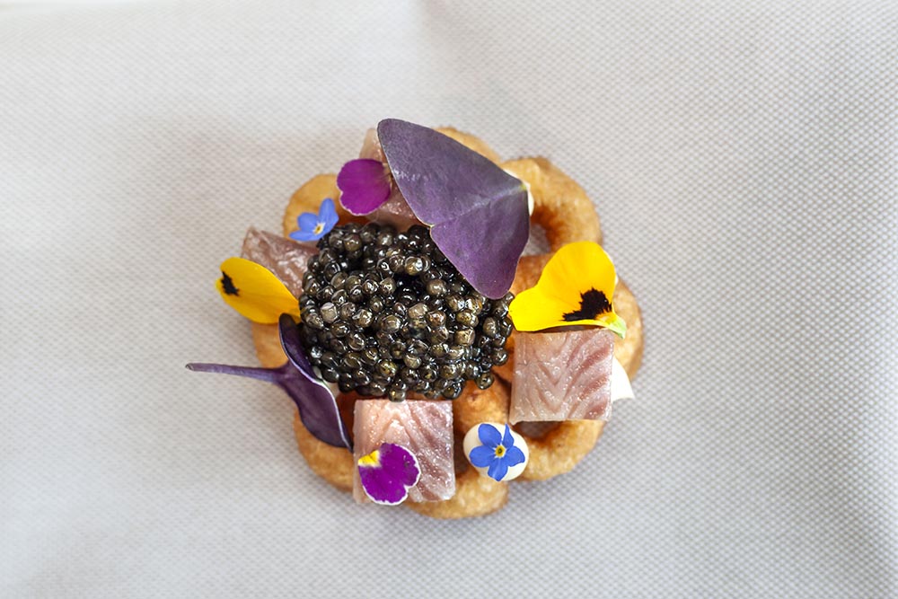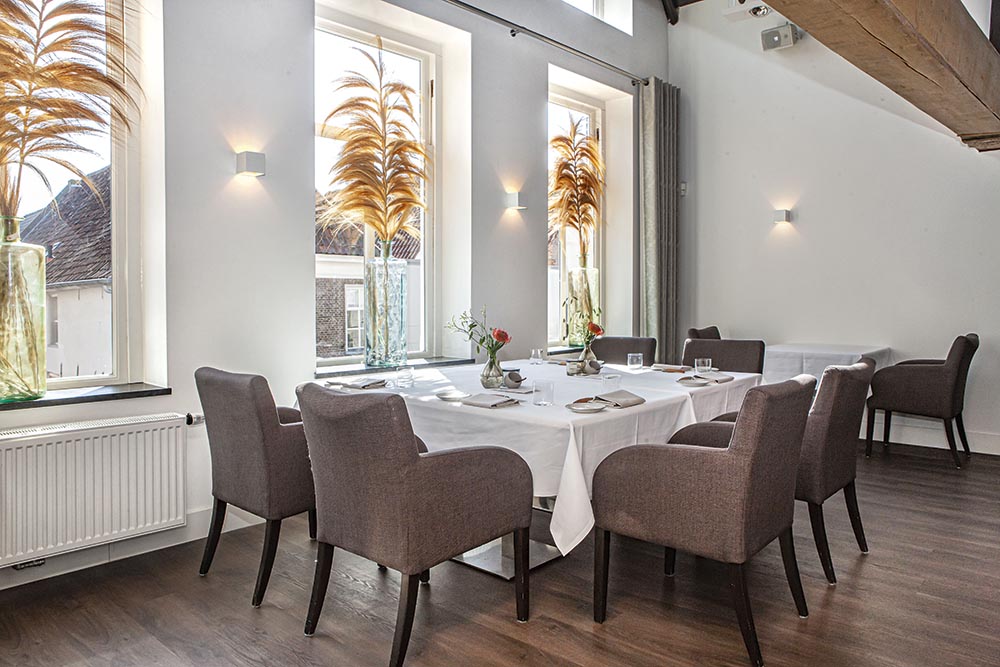 We hebben twee moestuinen waar veel groenten vandaan komen, op ons terras achter groeien de bloemetjes die we voor de versiering gebruiken en ook Dutch Cuisine maakt veel inzichtelijk.” De prijsaanpassing heeft er wel toe geleid dat je in de weekends alleen het zesgangenmenu kunt bestellen. Dat is bedrijfseconomisch gezien nodig, zo blijkt. “Maar’, zegt Hans Derks, “als dat voor een gast echt te veel is, vinden we daar een oplossing voor.” Dictaten horen niet bij goed gastheerschap, zo begrijpen wij. De naam ‘huiskamerrestaurant’ viel al even en Versaen is inderdaad niet erg groot. Toen wij er waren stonden er vier tafels voor twee personen en vier voor vier. Op de eerste verdieping zijn er twee private dining plekken: een grote vierkante tafel voor en een langwerpige tafel achter. Daar heb je het even goed als beneden, want er is een kleine tweede keuken en een voedsellift.