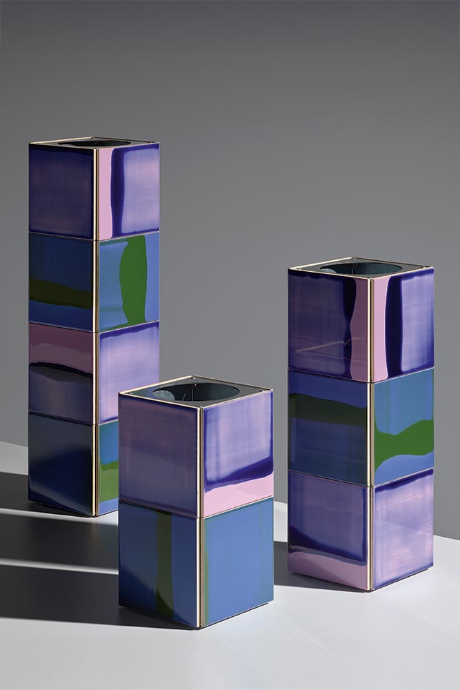 Concept: trapvormige vazen in drie maten en vier kleuren: groen, amber, grijs en paars. De geribbelde details en het subtiele kleurverloop geven de Steps hun unieke uitstraling. Voor een enkele sierlijke tak, of weelderige bos bloemen. Met bijpassende kaars- en waxinelichthouder.